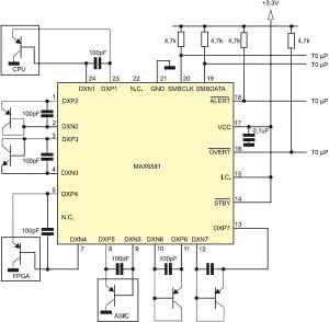 Często wykorzystywanym sposobem na pomiar temperatury, w szczególności wewnątrz układów, jest odczyt napięcia złącza baza-emiter w tranzystorze w połączeniu diodowym. Napięcie to jest zależne od temperatury. Przykładem interfejsu do pomiarów temperatur tym sposobem jest układ MAX6581 (rysunek 1).