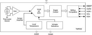 Firma Texas Instruments wypuściła na rynek pierwszy z serii układ do bezdotykowego pomiaru temperatury. W jednej obudowie z czujnikiem IR zintegrowano między innymi wzmacniacz, przetwornik A/D oraz sensor temperatury otoczenia (rysunek 2). Układ może być zasilany napięciem z przedziału 2,2...5,5 V, a komunikacja odbywa się poprzez interfejs I2C. Zatem stosować go można w aplikacjach z praktycznie każdym mikrokontrolerem.