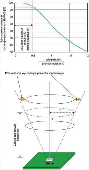 Zmieniając odległość (d) pomiędzy obiektem, a czujnikiem można zauważyć, że dla stosunku (d/r)<(1/2) ilość promieniowania IR emitowanego przez obiekt jest pochłaniana przez czujnik w ponad 90%.