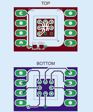 Płytka PCB została zaprojektowana w taki sposób, aby możliwy był dostęp do wszystkich pinów TMP006, w tym ustalanie jego adresu, a także szybki montaż na płytkach PCB systemów w których czujnik będzie wykorzystywany lub podpięcie pod płytkę przewodu do czujnika.