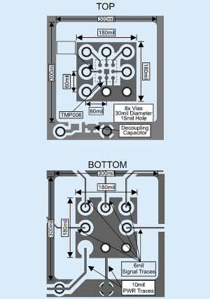 Aby pomiar był jak najbardziej dokładny, układ TMP006 należy umieścić na płytce PCB w odpowiedni sposób (rysunek 4). Projektując płytkę PCB potrzeba zwrócić uwagę na konieczność zastosowania izolacji termicznej wokół czujnika (w postaci obwódki wytrawionego laminatu), dzięki czemu możliwa jest minimalizacja podgrzewania czujnika przez inne układy generujące ciepło. Kolejną ważną rzeczą o której należy pamiętać jest odległość z jakiej powinien być dokonywany pomiar.
