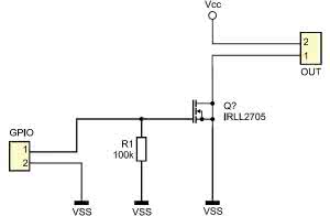Tranzystor IRLL2705 ma bardzo niskie napięcie załączenia bramki (Rdson) umożliwiając jego sterowanie bezpośrednio z portu mikrokontrolera. W wypadku, gdy jest konieczne dołączenie układów zasilanych np. bezpośrednio z sieci energetycznej, układ możemy uzupełnić o dodatkowy przekaźnik oraz diodę zabezpieczającą.