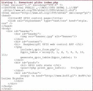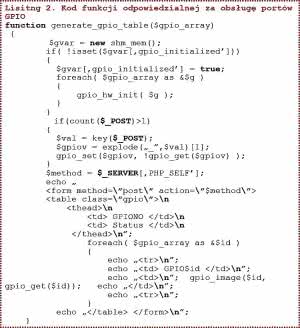 Plik ten w głównej części zawiera definicję strony internetowej, oraz niewielki fragment kodu PHP, rozpoczynający się od znacznika <?php. Główny układ strony został podzielony na 4 części za pomocą sekcji div: <div id="header"> - zawierający banner <div id="content"> zawierający tabelkę z wizualizacją stanu portów, <div id="pinfo"> zawierający informację o stanie linii wszystkich portów, oraz <div id="footer"> - zawierający definicję stopki. W zmiennej $gpio_table zdefiniowano listę konfiguracyjną portów, do których dołączone są urządzenia zewnętrzne, którą należy dostosować do własnej konfiguracji dołączonych urządzeń. Numery na liście są zgodne z numeracją portów przedstawioną na rys. 1. Za renderowanie fragmentu strony związanej ze stanem portów oraz ich sterowaniem odpowiada funkcja generate_gpio_table(), do której jako pierwszy argument przekazywana jest lista konfiguracyjna wykorzystanych portów. Kod funkcji umieszczony został w pliku gpio_form.php. W kolejnej sekcji <div id="pinfo"> jest wywoływana funkcja print_gpio_info(), której wynik stanowi bezpośredni rezultat wykonania polecenia gpio readall. Jak już wcześniej wspomniano sekcja ta pełni jedynie rolę informacyjną i jeśli nie chcemy wyświetlać tych informacji wystarczy, usunąć z pliku całą sekcję <div id="pinfo"></div>. Kod funkcji odpowiedzialnej za obsługę portów generate_gpio_table() przedstawiono na listingu 2.