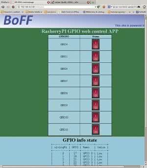 Po wpisaniu w przeglądarce nazwy hosta lub bezpośrednio adresu IP na komputerze docelowym zostanie wyświetlona strona www zawierająca opis numerów portów wejścia-wyjścia oraz przełączniki zapewniające wizualną kontrolę stanu linii portów. Sterowanie urządzeniem odbywa się poprzez kliknięcie odpowiedniego przełącznika, w wyniku czego następuje fizyczna zmiana stanu linii portu - a zatem załączenie bądź wyłączenie sterowanego przez nią urządzenia. Poniżej poziomu przełączników jest wyświetlana informacja tekstowa o stanie wszystkich dostępnych portów GPIO pochodząca wprost z wyjścia stdout aplikacji gpio. Wyświetlana informacja służy w zasadzie wyłącznie do celów diagnostycznych i może być w prosty sposób wyłączona bezpośrednio w kodzie PHP. Po wyłączeniu informacji diagnostycznej na stronie www będzie wyświetlany tylko i wyłącznie panel wyłączników, bez dolnego paska statusu.