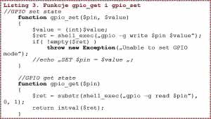 Zasada działania tych funkcji jest bardzo prosta i sprowadza się do wywołania programu gpio z odpowiednimi argumentami, za pomocą funkcji shell_exec(). Funkcja ta jako argument przyjmuje polecenie do wykonania przez powłokę, a jako wartość zwraca łańcuch tekstowy stanowiący wynik wykonania komendy. Wpisując zatem odpowiednie argumenty dla programu gpio, możemy kontrolować poszczególne linie wejścia-wyjścia komputera.