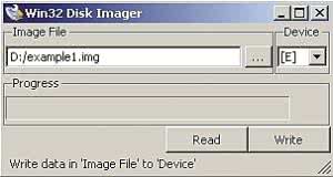 Najprostszą metodą na uruchomienie aplikacji jest bezpośrednie wgranie na kartę SD przygotowanego obrazu dysku, zawierającego system Linux wraz przygotowanym przykładem aplikacji "przełącznika ethernetowego". Obraz został przygotowany dla karty o pojemności minimum 4 GB i jest udostępniony w postaci pliku o nazwie Raspberry-gpio.7z (spakowany za pomocą programu 7ZIP). Pierwszą czynnością jest rozpakowanie z archiwum pliku obrazu Raspberry-gpio.img, który następnie należy wgrać na kartę SD. W systemie Windows obraz można nagrać za pomocą programu Win32diskImager. Aplikację można pobrać ze strony https://wiki.kubuntu.org/Win32DiskImager. Po zakończeniu pobierania do czytnika kart SD należy włożyć kartę, czytnik podłączyć do komputera i uruchomić program. Jako opcje image file należy wybrać plik Raspberry-gpio.img , natomiast jako device należy wybrać identyfikator dysku, któremu został przypisany czytnik kart SD (rysunek 4).