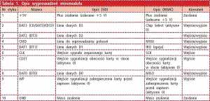 Podłączenie karty SD do zestawu. Aby uruchomić prezentowane przykłady należy podłączyć minimoduł Kamod- MMC do zestawów ewaluacyjnych. Moduł karty SD zaprojektowano do współpracy z mikrokontrolerami zasilanymi napięciem 5 V i w związku z zastosowaniem dodatkowego stabilizatora 3,3 V powinien być zasilany napięciem 5 V. W tabeli 1 przedstawiono opis wyprowadzeń minimodułu.