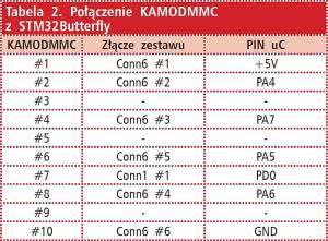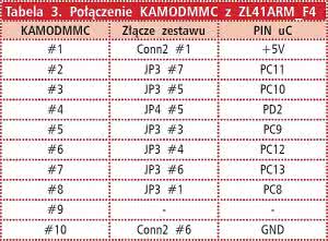 W przypadku zestawu ZL41ARM_F4 wykorzystujemy tryb natywnej 4-bitowej magistrali SD, zapewniającej przy standardowej prędkości transmisji 25 MHz przepustowość 100 Mbps. W związku z tym minimoduł Kamod-MMC należy dołączyć do zestawu zgodnie z tabelą 3.