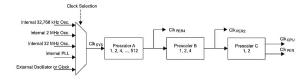 Uproszczony schemat układu dystrybucji sygnałów zegarowych przedstawiono na rysunku 1. Po wybraniu jednego z pięciu dostępnych źródeł, do dyspozycji są aż trzy preskalery umożliwiające taktowanie poszczególnych peryferiów mikrokontrolera z różnymi częstotliwościami sygnału zegarowego.