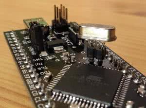 Większość producentów płytek testowych narzuca częstotliwość kwarcu lutując go do płytki na stałe. Odlutowanie kwarcu, w szczególności SMD, może spowodować jego uszkodzenie lub oderwanie miedzianych ścieżek od laminatu. Moduł prototypowy X3-DIL64 wyposażono w podstawkę pod kwarc, dzięki czemu użytkownik może szybko i bez lutowania podłączyć taki kwarc, jaki uzna za najlepszy do swoich potrzeb. Wygląd podstawki pokazano na fotografii 5.
