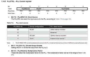 Niewłaściwie konfigurując układ PLL można mocno przekroczyć dopuszczalna częstotliwość taktowania mikrokontrolera, co może prowadzić do jego niestabilnej pracy. Rdzeń mikrokontrolera może pracować taktowany przebiegiem o częstotliwości do 32 MHz. Częstotliwość na wyjściu układu PLL nie powinna być niższa niż 10 MHz, ani wyższa niż 200 MHz. W razie potrzeby można zastosować preskalery (widoczne na rys. 1), aby zmniejszyć częstotliwość przebiegu.