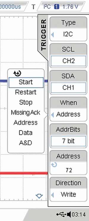 Menu wyzwalania dla protokołu I²C przedstawiono na rysunku 35. Pierwsze trzy pola są powtórzeniem nastaw konfiguracyjnych analizatora, a więc np.: "Type"=I²C, "SCL"=CH2, "SDA"=CH1. Warto już na początku wybrać tryb wyzwalania Normal, który w większości przypadków będzie najbardziej odpowiedni. W trybie "Auto" oscylogram może być niestabilny.