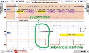 Przebiegi występujące na liniach interfejsu I²C zostaną wyświetlone na ekranie nawet po zastosowaniu zwykłego wyzwalania zboczem. Prawdopodobnie obraz nie będzie jednak stabilny, konieczne będzie skorzystanie z jednej z opcji wyzwalania, które są dedykowane dla protokołu I²C.