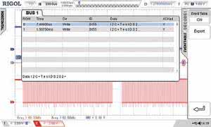 Niezależnie od trybów wyzwalania oscyloskop Rigol DS2202 pracujący jako analizator protokołu I²C, może wyświetlać zdekodowane dane jako oscylogramy lub w postaci tabelarycznej. Tabela jest włączana po naciśnięciu przycisku Decode1 (Decode2) i przejściu na drugą stronę menu. Należy uaktywnić polecenie "Event Table". Zdekodowane w ten sposób dane przedstawiono na rysunku 43.