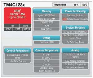 - DK-TM4C123G Development Kit Zestaw uruchomieniowy z procesorem TM4C123GH6PGE (ARM Cortex-M4F, obudowa 144-LQFP). Zawiera kolorowy wyświetlacz OLED, gniazdko USB-OTG/Host/Device, gniazdko microSD, kontroler CAN, czujnik temperatury i 9-osiowy czujnik położenia.