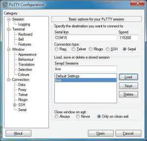 <p>Program przykładowy był uruchamiany z obsługą komunikacji na PC poprzez program PuTTY (do pobrania darmowo ze strony http://www.putty.org). Poprawna praca wymaga ustawienia parametrów komunikacji 115200 8N1. Po uruchomieniu programu PuTTY wybierz typ połączenia Serial a następnie wpisz poprawny numer portu COMxx oraz szybkość transmisji i kliknij Open (rysunek 4).</p>