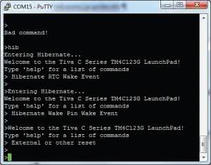 <li>'hib' powoduje prowadzenie procesora TM4C123GH6PMI w stan hibernacji. Jedynym sposobem powrotu do do wyświetlania podstawowej sekwencji jest przyciśnięcie prawego przycisku SW2. </li>