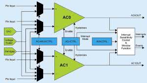 W mikrokontrolerach XMEGA wyróżnia się porty cyfrowe i analogowe. Dzięki portom cyfrowym są dostępne wyjścia generatorów PWM, interfejsy komunikacyjne itp. Przyzwyczailiśmy się do tego, że peryferia cyfrowe są powielone na każdym porcie. Dla peryferiów analogowych jest tak samo - przetworniki i komparatory również są powielone. Każdy port analogowy ma dwa komparatory, a procesor ATxmega128A3U na płytce eXtrino XL ma dwa takie porty, zatem mamy do dyspozycji aż cztery komparatory analogowe - oznaczone ACA.AC0, ACA. AC1, ACB.AC0, ACB.AC1.