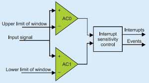W obrębie jednego portu analogowego dwa komparatory mogą współpracować tworząc komparator okienkowy. Do takiego układu doprowadzamy jedno napięcie badane oraz dwa napięcia referencyjne. Komparator okienkowy umożliwia stwierdzenie czy badany sygnał jest pomiędzy napięciami referencyjnymi (w oknie), poniżej lub powyżej okna. Schemat takiego rozwiązania przedstawiono na rysunku 2.