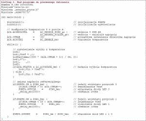 Wynik porównania oraz ustalone napięcie z wbudowanego dzielnika będziemy monitorować na wyświetlaczu (użyłem wyświetlacza VFD 4×20, ale można zastosować dowolny wyświetlacz ze sterownikiem HD44780, co opisałem w EP 11/2013). Przejdźmy do programu, którego kod przedstawiono na listingu 1, a schemat układu przedstawiono na rysunku 3.