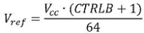 W rejestrze ACA.CTRLB ustalamy 64-stopnowy dzielnik napięcia zasilającego. Możemy wybrać liczbę z przedziału od 0 do 63. Im wyższa to będzie liczba, tym wyższe napięcie uzyskamy. Uzyskana napięcie można wyliczyć z prostego wzoru: