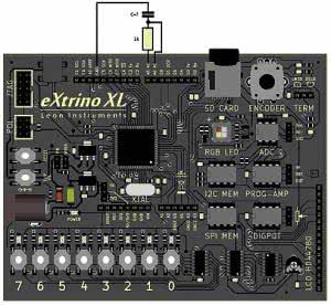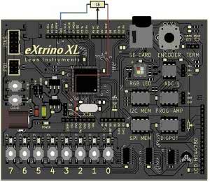 - Napięcie z wbudowanego dzielnika doprowadzamy do wejścia odwracającego (-), a za pomocą przycisków 0 i 1 na płytce eXtrino XL będziemy mogli to napięcie regulować.