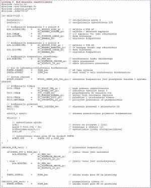 Pierwsze dwie linijki funkcji main() to standardowa inicjalizacja wyświetlacza oraz PORTX. Następnie musimy skonfigurować komparator, wpisując odpowiednie bity do zaledwie trzech rejestrów. W rejestrze ACA. AC0MUXCTRL konfigurujemy, z którymi pinami lub źródłami napięcia referencyjnego mają być połączone wejście odwracające i nieodwracające komparatora o numerze 0. Wejście nieodwracające łączymy z pinem A6, natomiast wejście odwracające będzie połączone z wewnętrznym dzielnikiem napięcia.