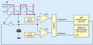 Istnieje wiele metod pomiaru pojemności kondensatora, a najprostsza z nich polega na zbudowaniu z wykorzystaniem jednego lub dwóch komparatorów oscylatora o częstotliwości zależnej od dołączonej pojemności. Wszystko, co tylko możliwe, "upchniemy" wewnątrz procesora, a jedyne co do niego musimy dołączyć, to rezystor 1 kV oraz badany kondensator. Schemat układu przedstawia rysunek 4, a jego zdjęcie widoczne jest na fotografi i 5.