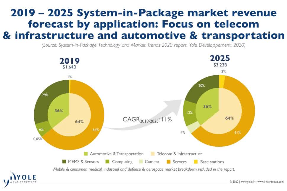 W segmencie stacji bazowych, serwerów i telekomunikacji oczekuje się wzrostu charakteryzującego się dwucyfrowym CAGR-em, przy czym dla stacji bazowych wyniesie on aż 41%. Motorem wzrostu w tym segmencie będą stacje bazowe 5G, w których wykorzystuje się coraz więcej układów SiP zamykanych metodą flip-chip (FC) w formie BGA. Ponadto serwery zawierają wysokiej klasy chipy SiP, takie jak CPU, PU (chiplety, interposer Si, FO) i FPGA.