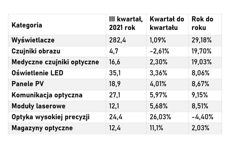 Zgodnie z danymi przygotowanymi przez Stowarzyszenia Rozwoju Przemysłu Fotonicznego i Technologii (PIDA) tajwańscy producenci komponentów optoelektronicznych wygenerowali 433,7 mld NT (15,5 mld dolarów) w trzecim kwartale 2021 roku, co oznacza wzrost o 3,28% w ujęciu kwartalnym i o 20,60% rok do roku.