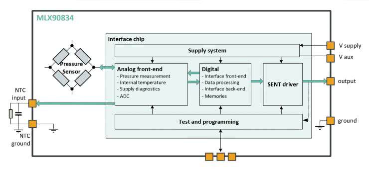 MLX90834 może współpracować z zewnętrznym termistorem NTC. Dzięki fabrycznej kalibracji zapewnia dokładność pomiaru temperatury lepszą niż ±1°C. Dokładność pomiaru ciśnienia wynosi ±0,5% FS przez cały okres eksploatacji. Układ jest zabezpieczony przed przepięciami do 40 V i odwróceniem polaryzacji napięcia zasilającego. Może być stosowany w systemach o poziomie nienaruszalności bezpieczeństwa do ASIL C. Uzyskał kwalifikację AEC-Q100.
