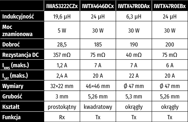 Cewka odbiorcza IWAS3222CZEB190JR1 charakteryzuje się indukcyjnością 19,6 μH, dobrocią 28,5 @ 200 kHz i rezystancją DC równą 357 mΩ. Cewki nadawcze IWTX4646DCEB240JR1, IWTX47R0DAEB6R3JR1 i IWTX47R0EBEB240JR1 o indukcyjności z zakresu od 6,3 μH do 24 μH wykazują małą rezystancję DC, już od 40 mΩ, dobroć 185...200 i prąd znamionowy do 7 A. Wysoka wartość prądu nasycenia, sięgająca 22 A, zapewnia stabilną indukcyjność w szerokim zakresie natężenia prądu roboczego.