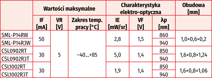 Firma Rohm dodaje do oferty diod LED NIR nowe wersje o dużym natężeniu promieniowania, zaprojektowane do zastosowań w przemysłowych czujnikach optycznych, drukarkach, pulsoksymetrach oraz aplikacjach AR/VR (śledzenie wzroku, rozpoznawanie gestów). Są one dostępne w 6 wariantach, produkowanych w 3 typach obudów. Dwa nadajniki, stanowiące rozszerzenie rodziny Picoled – SML-P14RW i SML-P14R3W – są zamykane w miniaturowych obudowach o wymiarach 1,0×0,8×0,2 mm. Cztery pozostałe są dostępne w standardowych obudowach o powierzchni 1,6 ×0,8 mm. CSL0902RT i CSL0902R3T zawierają okrągłe soczewki o wąskim kącie emisji, natomiast CSL1002RT i CSL1002R3T to diody z soczewkami płaskimi o szerokim kącie emisji. Każdy z wariantów obudowy jest dostępny w dwóch wersjach, pracujących na długości fali 850 nm lub 940 nm.