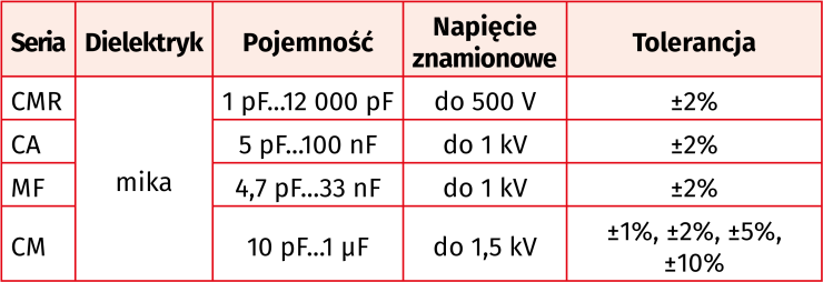 Precyzyjne kondensatory dużej niezawodności serii MF są polecane do układów w.cz. i czułych przyrządów pomiarowych oraz ogólnie do aplikacji o znaczeniu krytycznym. Do ich zalet należy duża dobroć i mały współczynnik temperaturowy. Dostępne są warianty o pojemności od 4,7 pF do 33 nF i napięciu znamionowym do 1 kV.