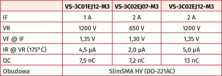Do oferty firmy Vishay wchodzą nowe diody Schottky’ego 3. generacji, zamykane w miniaturowych obudowach SlimSMA HV (DO-221AC) o drodze upływu wynoszącej powyżej 3,2 mm. Są one produkowane na podłożach SiC. Występują w wersjach o napięciu przebicia 650 V lub 1200 V oraz o prądzie znamionowym 1 A lub 2 A. W porównaniu z wcześniejszymi odpowiednikami w obudowach SMA i SMB, charakteryzują się ponad trzykrotnie mniejszą grubością (0,95 mm vs. 3,2 mm). W odróżnieniu od diod krzemowych wykazują mały ładunek wewnętrzny (7,2 nC) i niewielką zależność parametrów dynamicznych od temperatury. Ich zaletami są też: krótki czas przełączania i niskie napięcie przewodzenia, wynoszące od 1,3 V.