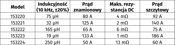 Obecnie oferta obejmuje 5 modeli o indukcyjności znamionowej od 32 do 250 μH, dopuszczalnym prądzie szczytowym do 186 A i rezystancji uzwojenia od 1 mΩ.
