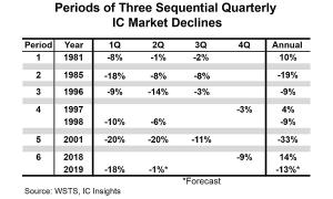 Zakładając, że rynek IC w drugim kwartale 2019 r. odnotuje niewielki spadek o 1% w porównaniu z kwartałem pierwszym, okres od IV kw. 2018 do II kw. 2019 oznaczałby szósty trzykwartalny spadek w historii (ilustracja poniżej). Jak widać w tabeli, takiego trzykwartalnego spadku nie było od 2001 roku. Co więcej, spadek przez trzy kwartały w 2001 r. był najwyższy w historii, z trzema dwucyfrowymi wynikami, co doprowadziło do najpoważniejszego rocznego spadku na rynku półprzewodników, który wyniósł 33%.