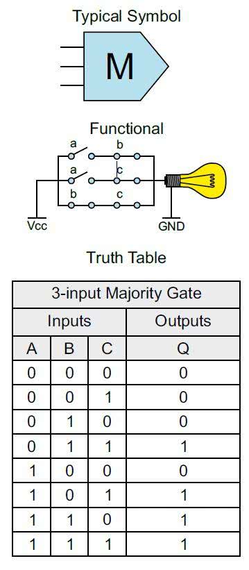 Jeżeli chce posłużyć się gotowym elementem to jak najbardziej ma taką możliwość - układ ten bowiem to bramka MAJ (majority), odpowiedzialna za tzw. funkcję większości, która realizuje wspomniane wcześniej działanie. Na ogół zastosowanie znajduje jej trójwejściowy wariant zwany MAJ3, którego symbol, sens fizyczny oraz tablicę prawdy pokazuje rysunek.