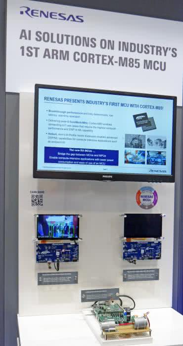 Wyraźnie widoczny jest trend umieszczania dodatkowych co-procesorów, które przyspieszają obliczanie sieci neuronowych i pozwalają na ograniczenie zużycia prądu w mikrokontrolerach. Firma STMicroelectronic planuje wdrożyć mikrokontrolery ze specjalistycznym, autorskim blokiem do takich zadań, a Renesas zaprezentował mikrokontroler Cortex-M85 z akceleratorem opracowanym przez ARM (fotografia 7). Jest to kierunek, który będzie miał duże znaczenie dla rozwoju systemów sztucznej inteligencji w systemach wbudowanych w przyszłości.