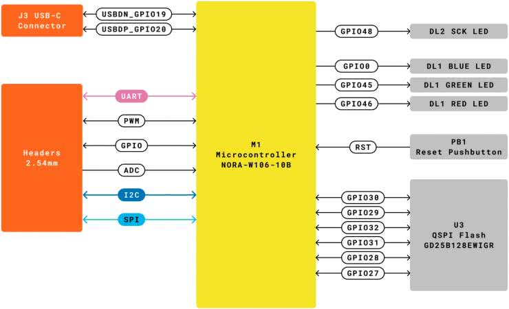 Na rysunku 1 został pokazany schemat blokowy płytki Nano, pokazujący wszystkie kluczowe komponenty tego małego systemu.