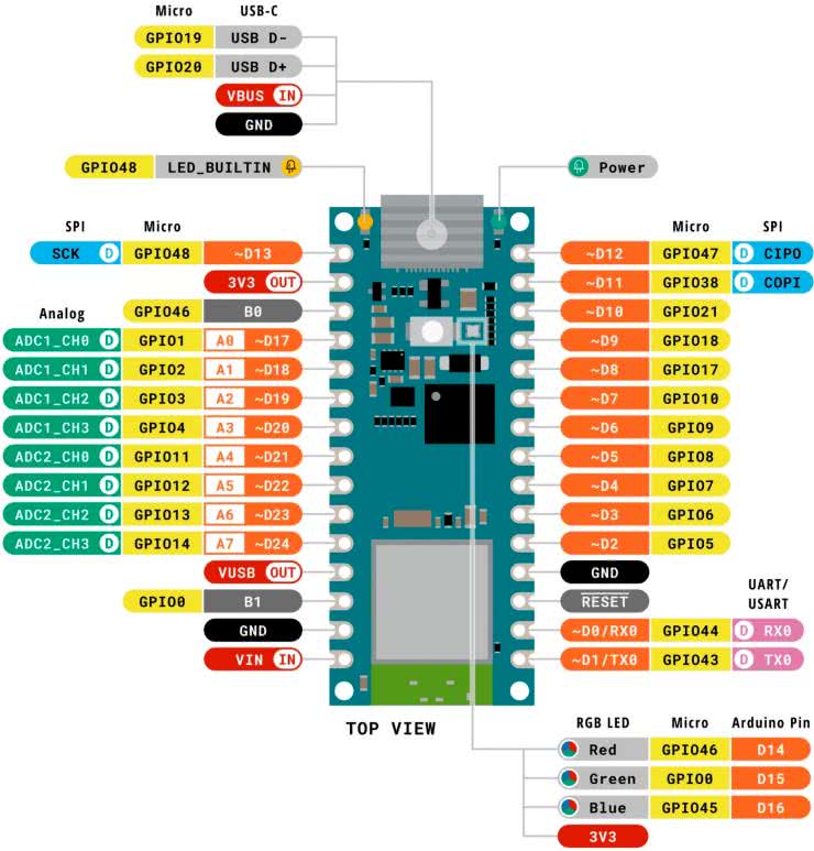 W przypadku Nano ESP32, pomimo zachowania formatu należy zwrócić uwagę na wyprowadzenia GPIO, których kilka przypisanych jest nieco inaczej niż w pozostałych płytkach Nano. Inne są też funkcje wyprowadzeń zasilania. Przyporządkowanie wyprowadzeń modułu zostało pokazane na rysunku 2.