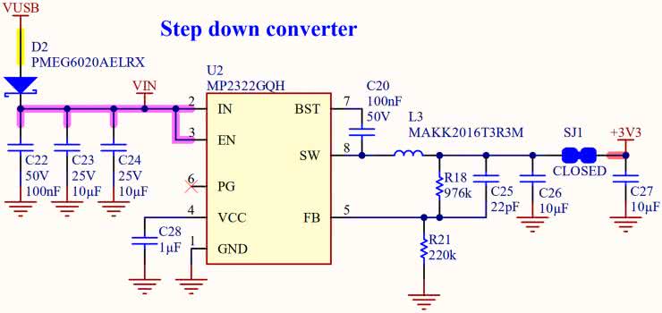 Sekcja zasilania ma też kilka innych uproszczeń, które należy mieć na uwadze przy aplikacji płytki. Na wyprowadzeniu VIN podczas zasilania z USB pojawia się napięcie VUSB, obniżone o spadek napięcia na diodzie D2. Więc wyprowadzenie VIN, staje się wyprowadzeniem VOUT – trzeba na to zwrócić uwagę.