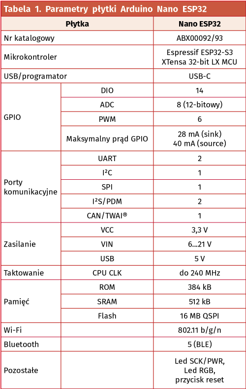 Arduino Nano ESP32 ma ułatwić tworzenie zaawansowanych aplikacji IoT, dzięki wydajnemu procesorowi i komunikacji bezprzewodowej. W tabeli 1 zestawiono podstawowe parametry nowego rozwiązania.
