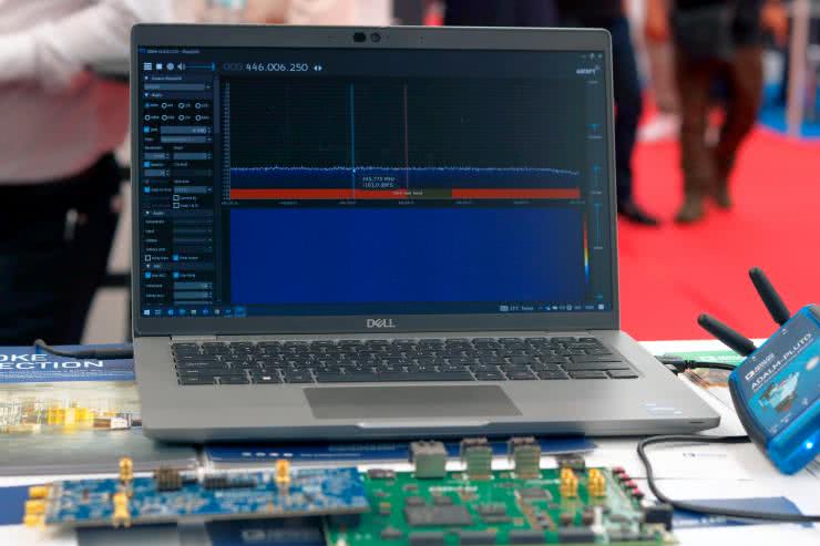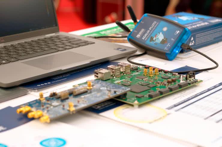 Analog Devices prezentowało na swoim stanowisko demo na żywo modułu ADALM-PLUTO, który jest dedykowany do aktywnego uczenia w zakresie systemów RF. Moduł ten, pomaga studentom kierunku poznać podstawy radia definiowanego programowo (SDR), technologii radiowych (RF) i komunikacji bezprzewodowej. Moduł ten, zaprojektowany został dla studentów na różnych poziomach zaawansowania i z różnym poziomem wiedzy. Może być wykorzystywany zarówno w nauczaniu prowadzonym przez instruktora, jak i w samodzielnej nauce samodzielnej. Moduł ten pokazano na fotografii 2. Towarzyszy mu oprogramowanie PlutoSDR (fotografia 3), które działa jak przenośna pracownia, która może wzbogacić proces nauki. PlutoSDR może współpracować z wieloma innymi pakietami, takimi jak MATLAB czy Simulink. Sam system posiada intuicyjny interfejs graficzny, który umożliwia szybszą naukę, efektywną pracę i eksplorację nowych technologii RF.