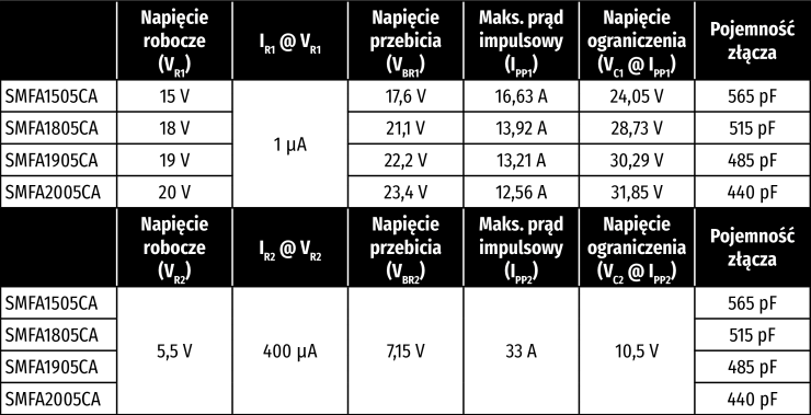 Obecnie oferta transili SMFA obejmuje 4 warianty: SMFA1505CA, SMFA1805CA, SMFA1905CA i SMFA2005CA o napięciach roboczych VR1 i napięciach przebicia VBR1 wynoszących odpowiednio: 15 V/17,6 V, 18 V/21,1 V, 19 V/22,2 V i 20 V/23,4 V. Wartości napięć roboczego VR2 oraz przebicia VBR2 są jednakowe dla wszystkich modeli i wynoszą odpowiednio: 5,5 V oraz 7,15 V.