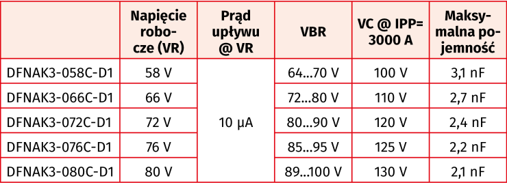 Dodatkowo charakteryzują się mniejszym napięciem ograniczenia (clamping voltage), zapewniającym skuteczniejszą ochronę komponentów elektronicznych. Są zgodne z wymogami normy IEC 61000-4-5 Level 4 w zakresie ochrony przepięciowej. Ich oferta obejmuje 5 wariantów o napięciu roboczym od 58 do 80 V.