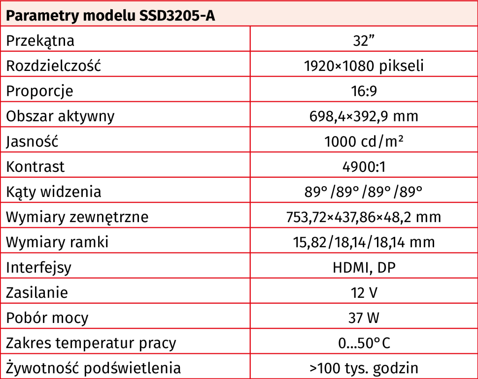 Model SSD3205-A może znaleźć zastosowanie w systemach digital signage, transporcie publicznym, na stoiskach targowych oraz wszędzie tam, gdzie klasyczny ekran się nie zmieści, a trójkątny kształt pozwala efektywnie zagospodarować dostępne miejsce.