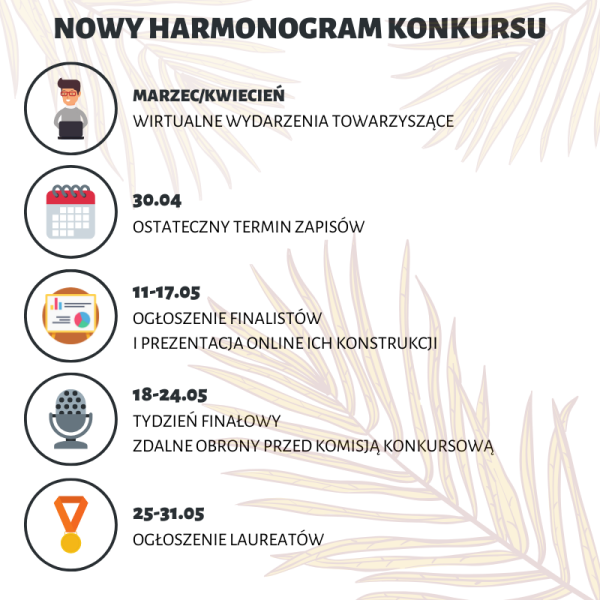 Zapisy do Konkursu Konstrukcji Studenckich (KOKOS) trwają nieprzerwanie, a dodatkowo zostały przedłużone do 30 kwietnia. Spośród uczestników zostaną wybrani finaliści, których konstrukcje zostaną zaprezentowane w formie ogólnodostępnej na platformie Facebook. Kolejny etap będzie obejmował tydzień finałowy, podczas którego konstruktorzy będą musieli obronić swoje projekty przed komisja konkursową w zdalny sposób. Na koniec, za pośrednictwem social mediów, zostaną ogłoszeni laureaci, a zwycięska konstrukcja w każdej kategorii otrzyma nagrodę główną w postaci 5 tysięcy złotych oraz dodatkowe nagrody rzeczowe.