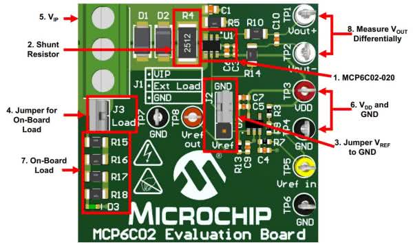 Płytka testowa pozwala na szybkie i wygodne rozpoczęcie pomiarów. Ma zintegrowany rezystor bocznikowy oraz obwód obciążający. Dołączenie zasilania oraz zewnętrznego obciążenia spowoduje niewielki, mierzalny spadek napięcia na rezystorze pomiarowym, który zostanie wzmocniony przez MCP6C02. Wyjściowy sygnał różnicowy jest dostępny w zaciskach: VOUT+ i VOUT– (TP1 i TP2).
