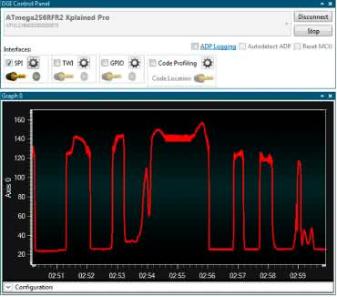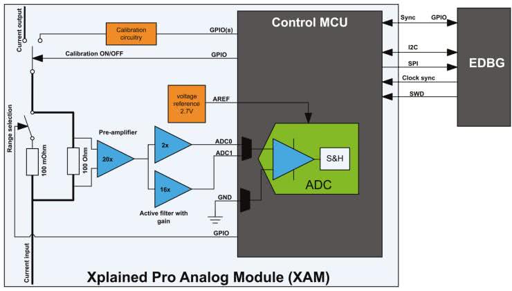 Zestaw ewaluacyjny zawiera rozbudowany blok do pomiaru prądu pobieranego przez mikrokontroler i/lub układy peryferyjne. Jest to XAM – Xplained Pro Analog Module i składa się z: rezystorów bocznikowych z przełącznikiem wyboru zakresu, przedwzmacniacza, dwóch aktywnych filtrów ze wzmocnieniem oraz obwodów napięcia referencyjnego i kalibracji. Takie rozwiązanie umożliwia osiągnięcie czterech zakresów pomiarowych od 1 μA przy rozdzielczości 20 nA, do 400 mA przy rozdzielczości 100 μA. Pomiary z bloku XAM mogą być przesyłane poprzez interfejs DGI do aplikacji prezentującej dane na wykresie.